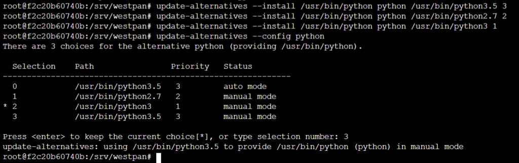 update-alternatives --install /usr/bin/python python /usr/bin/python3.5 3